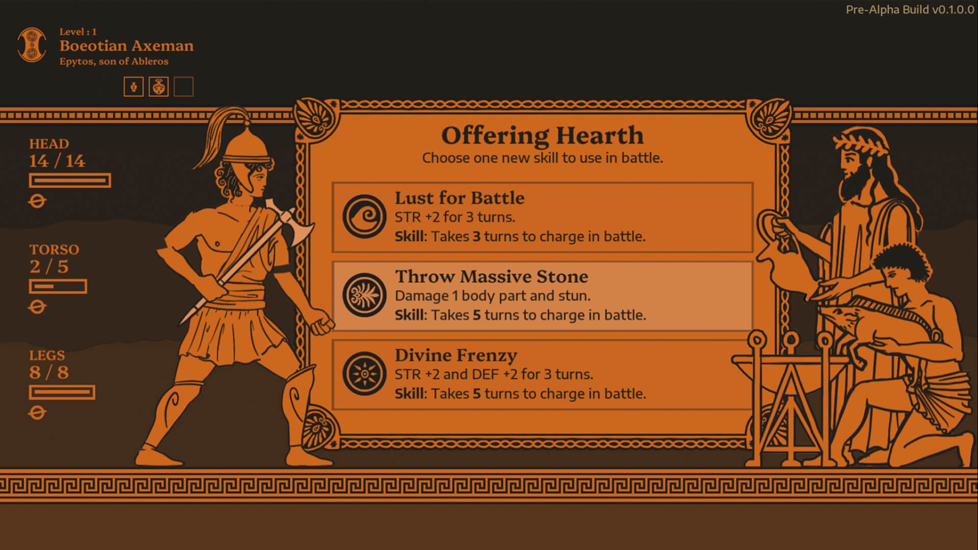 Excited to share the first public pre-alpha build of Red Clay, my turn-based single-combat RPG inspired by the Trojan War and Homer's Iliad, with a Greek pottery visual style. There’s a short tutorial in the game description below the embed to help get started. This is a very early build focused on testing core combat systems, and I’d really appreciate any feedback!