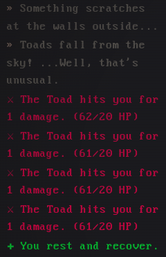 random campsite #512. "hearing hushed voices as spirits gather outside behind the walls" and flavor variations on the theme of being 'inside' have not once made sense in 57k turns. i'm sure they will eventually :-)