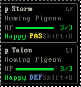seeing that they attack without getting attacked when on def, i bot another pigeon but find it impossible (dont have a stable/homestead yet, still looking for that t3 town) to get them both to be on 'def' since stances are disabled for non-combatants, at least 'somewhat'. Shift-O still cycles.