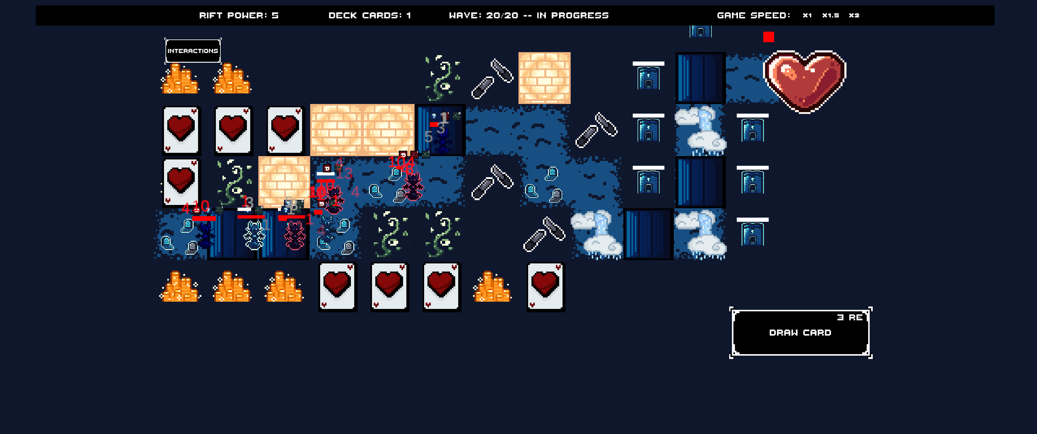 Now on to the things that could be better. Graphically the game isn't very compelling. It's kind off a mess of different art styles, there is a mix between different pixel sizes, there are issues with the UI; such as not being able to click on the picture of the card when you pick one. The music and sound effects got boring pretty quickly. The best thing about the graphics were the damage numbers flying through the screen near the end. It would have benefited the game a lot if you had focused more on picking a nice font and creating some different animations and effects to make it pop more. Balance wise like I already said I feel like there were a lot of good ideas mechanically but the game is totally bused (which I think is the right choice for a game that people are realistically going to play only once ever).