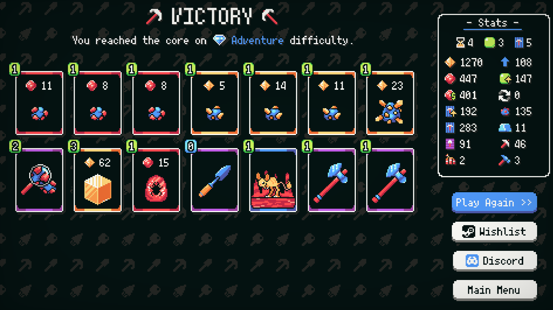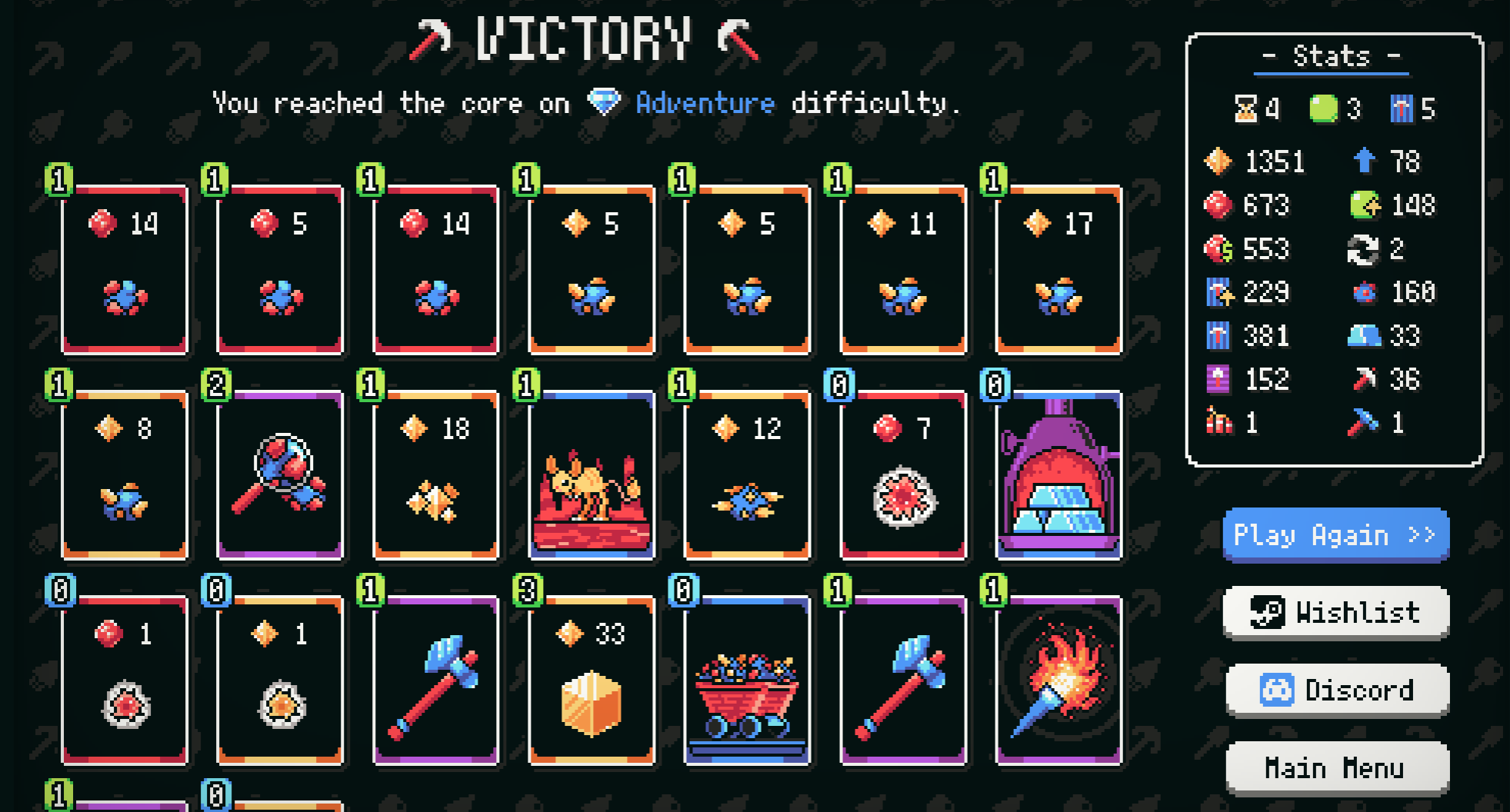 80% of runs are lost in the first round - if you don't get the 2x ore required each turn not much point in playing on (you'll miss out on the +1 turns). More restartminer than retrominer. It's not so much 'a difficult game' as an unbalanced one - if you can tweak the balance I think it would be great, but right now most strategires and combos are irrelevant, they are overwhelmed by the "play it exactly one way or else you are guaranteeed to los", making it more of a puzzle (second-guessing the designer's preferred combo) than a game.