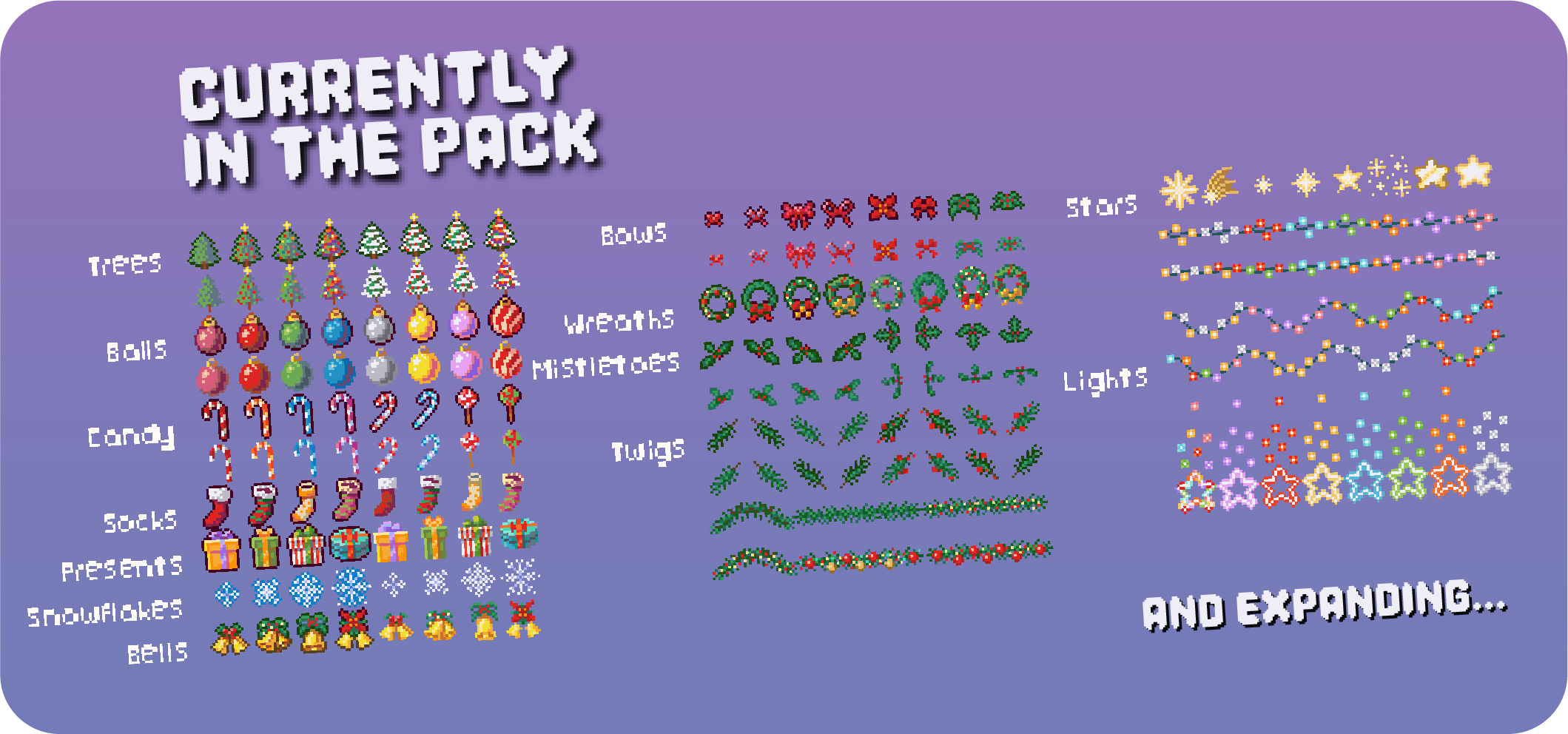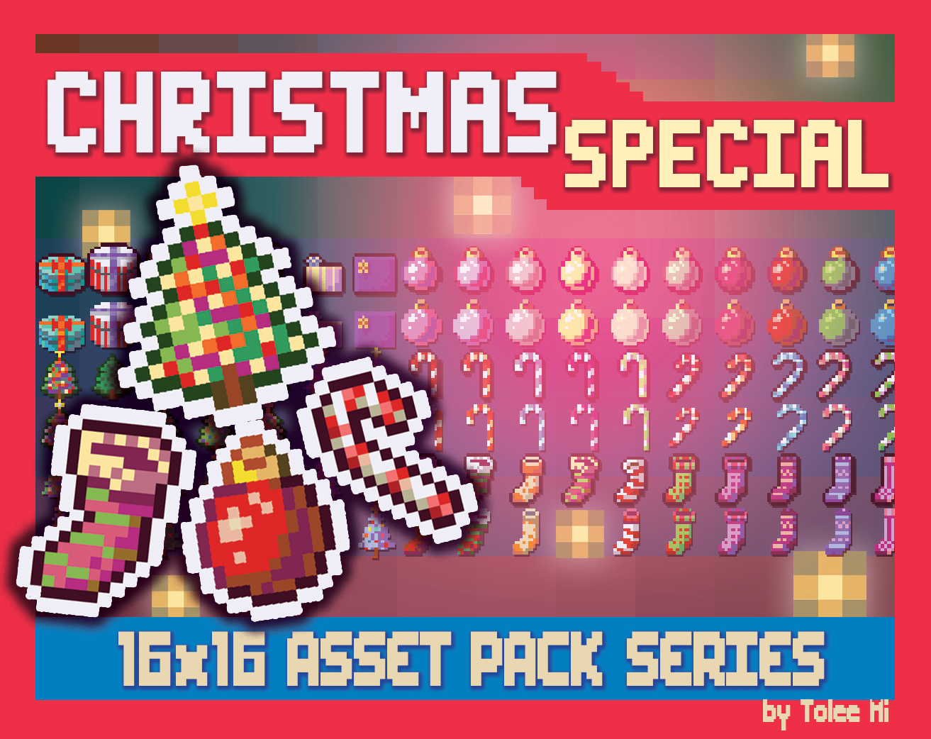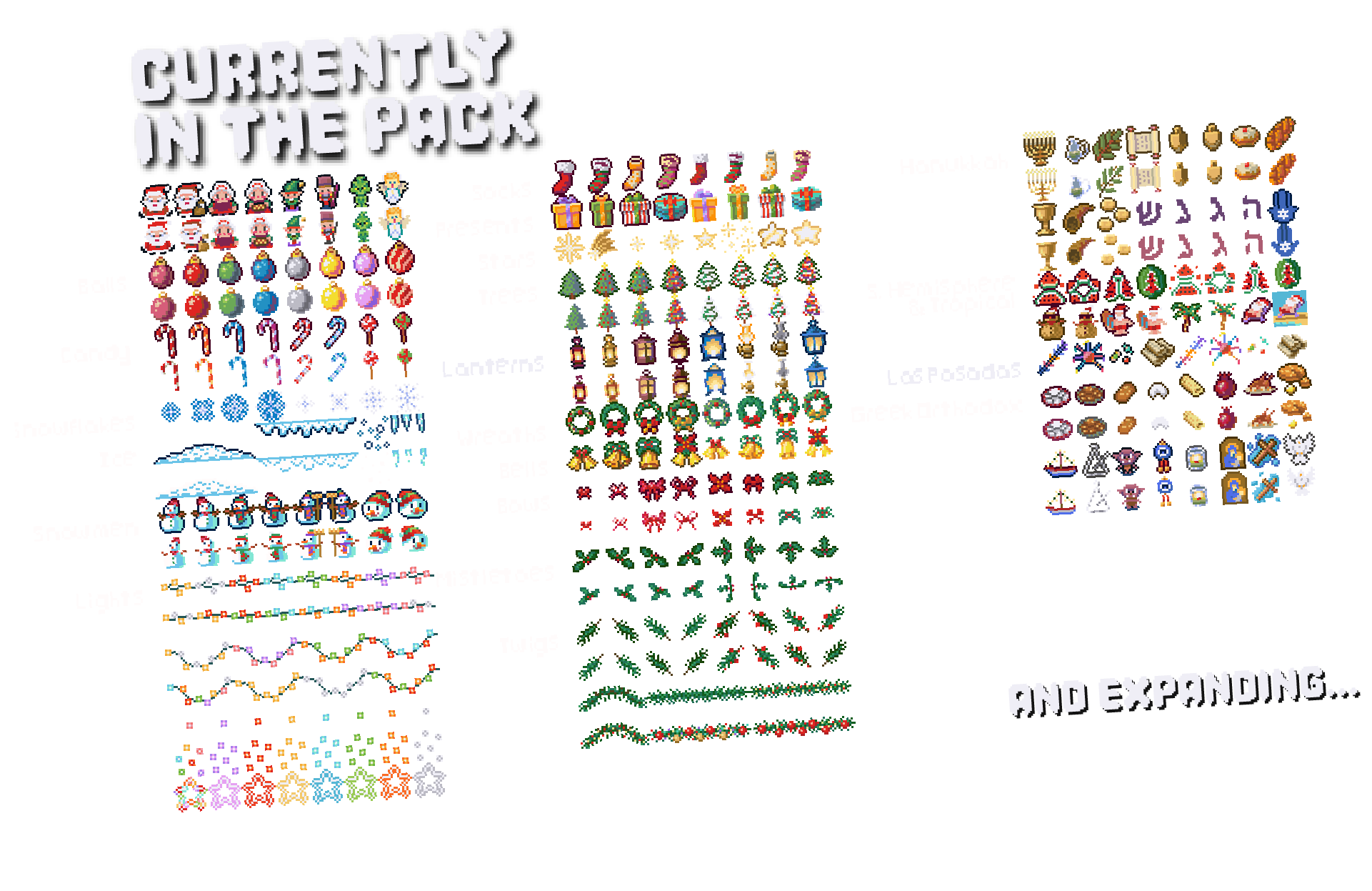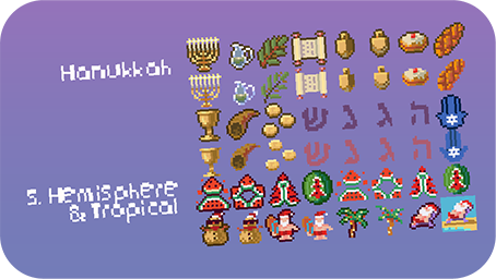 Celebrate the season with an ever-expanding Holiday Collection starting with Christmas! Featuring cute 16x16 pixel icons and props, this pack is made to decorate your virtual spaces and boost your Christmas Jam projects.