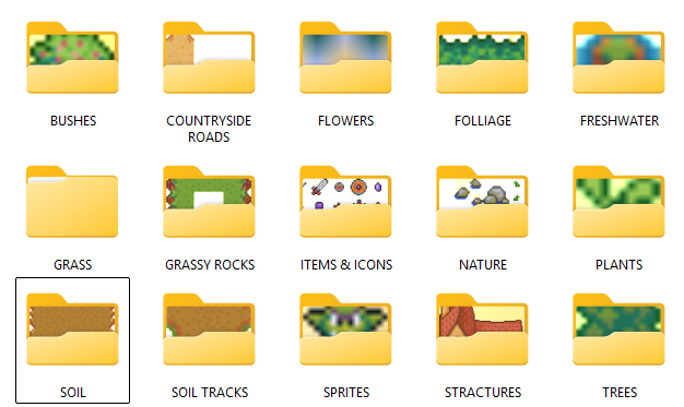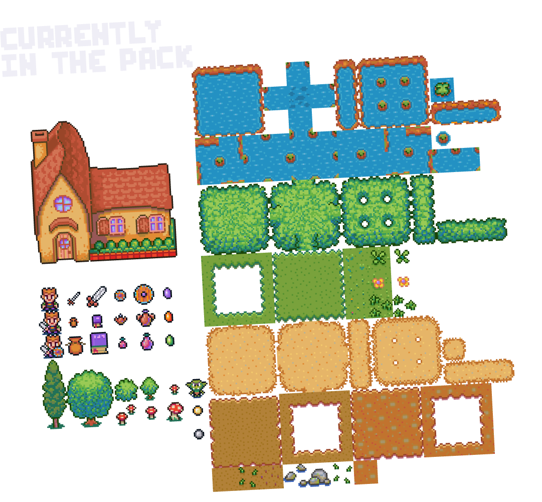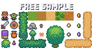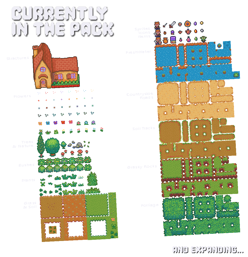 - Biomes / Tilesets (Freshwater -ponts, rivers, lakes and streams / Grassy Plains and Meadows / Bushes and vegetation / Soil variations / Tracks, country roads, paths, lots, / Grass on rocky terrain