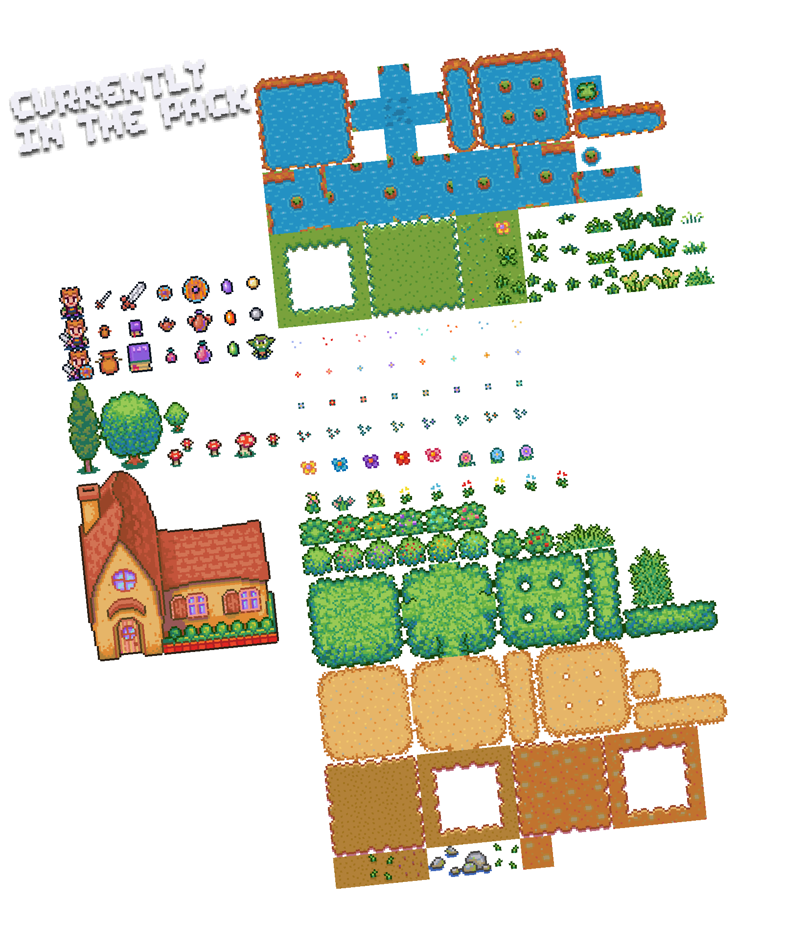 - Sprites, icons and items (sword, shield, coins,book, purse, gems, jars)