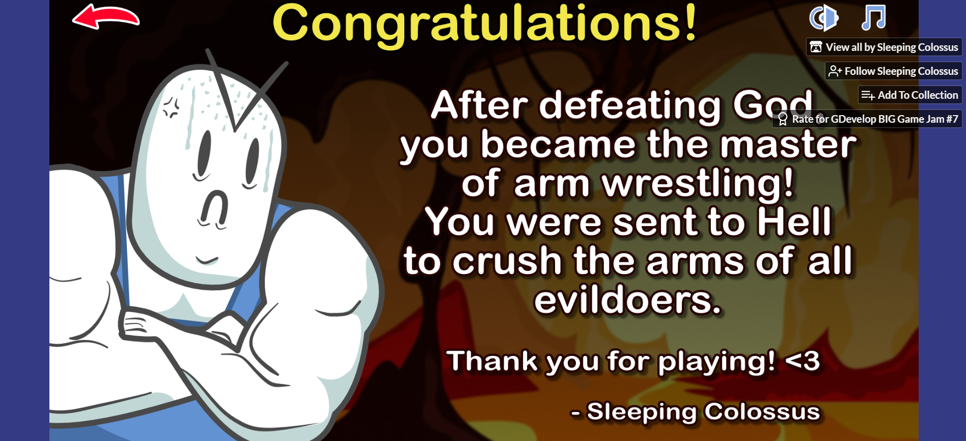 You did pretty well with this game than me, it was quite enjoyable, you're doing great with follow the jam theme's name though with that about arm wrestling thing. Also, I did beat the game, thanks! ^^