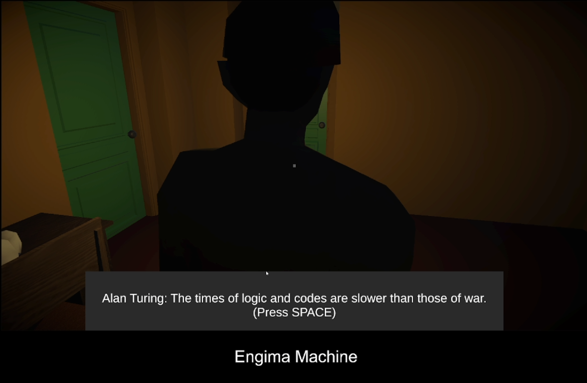 I was in the shoes of Turing, and felt his impatience and stress as I dealt with the BIS (it helped that I only spoke to his back). Really immersive experience, although I got stuck fairly fast while trying to solve the cypher. I probably lost the script along the way of what to do, but would love to know how it’s meant to be played! Thanks for the entry!
