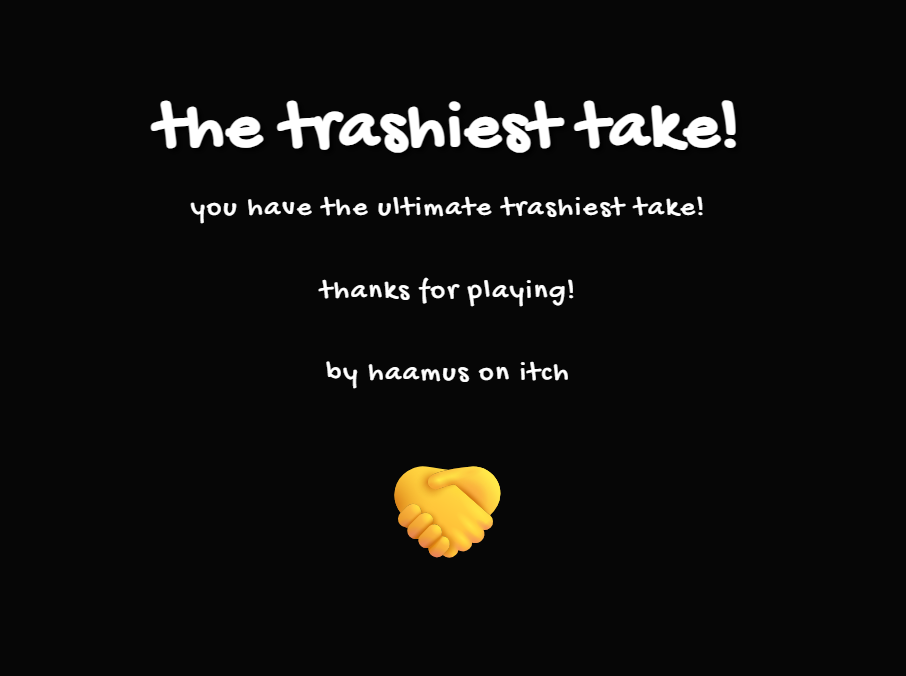 But I shall come back after the jam when I'm sure everything gets fixed to witness it! This is a game I could eeeeasily play for hours and was actually bummed at how quickly I finished it. (Although tbf, I was a bit confused by the dice mechanics at first, cause I'm unfamiliar with these kinds of games, and just chose big number go up and do massive damage!! XD)