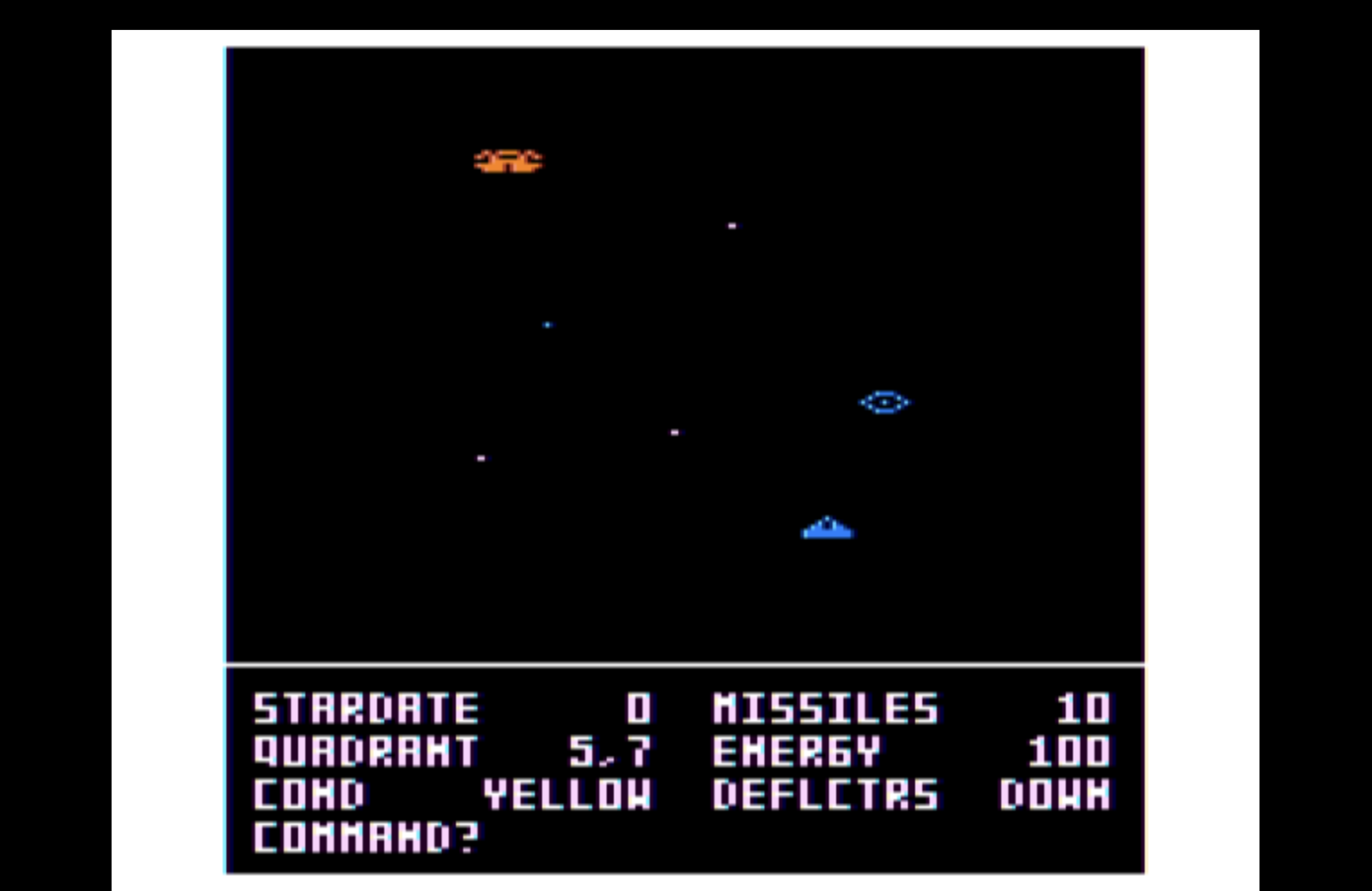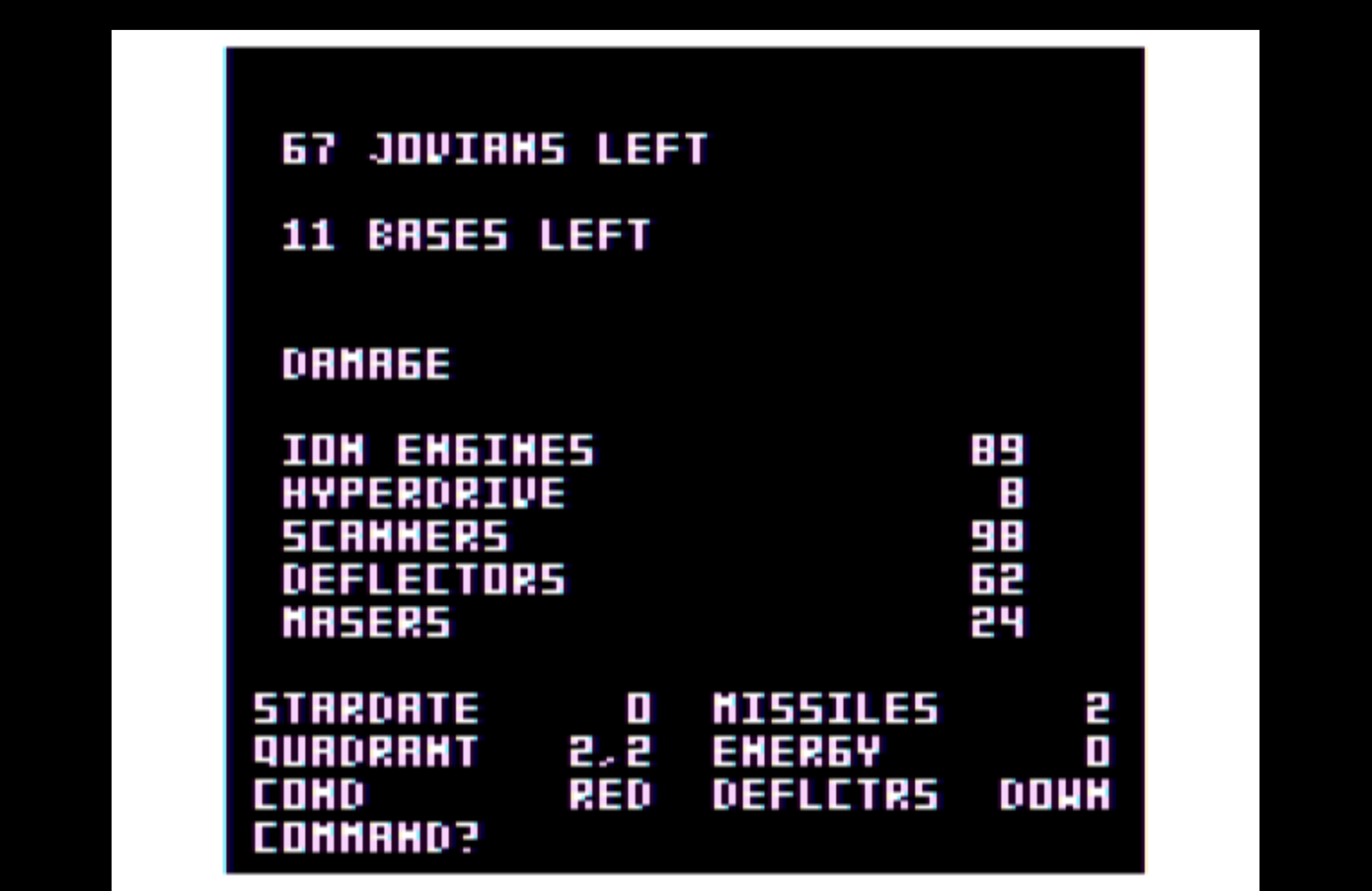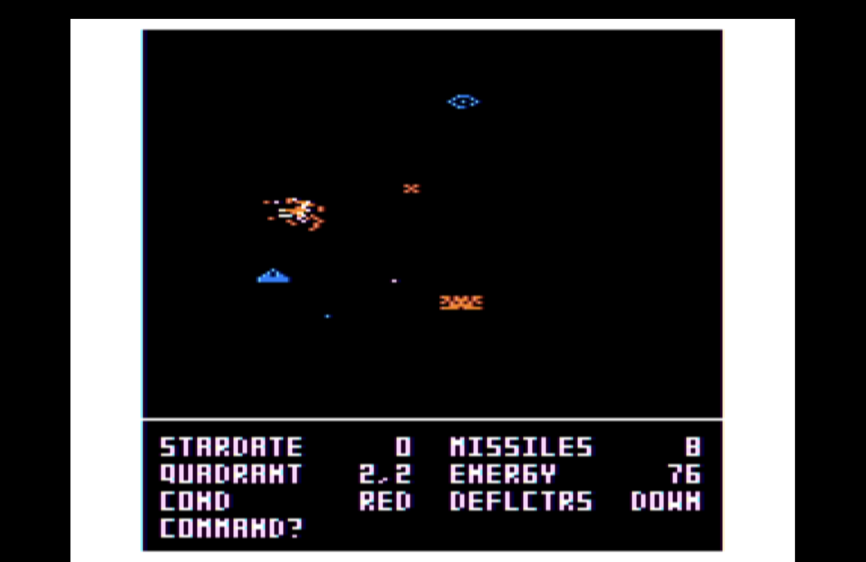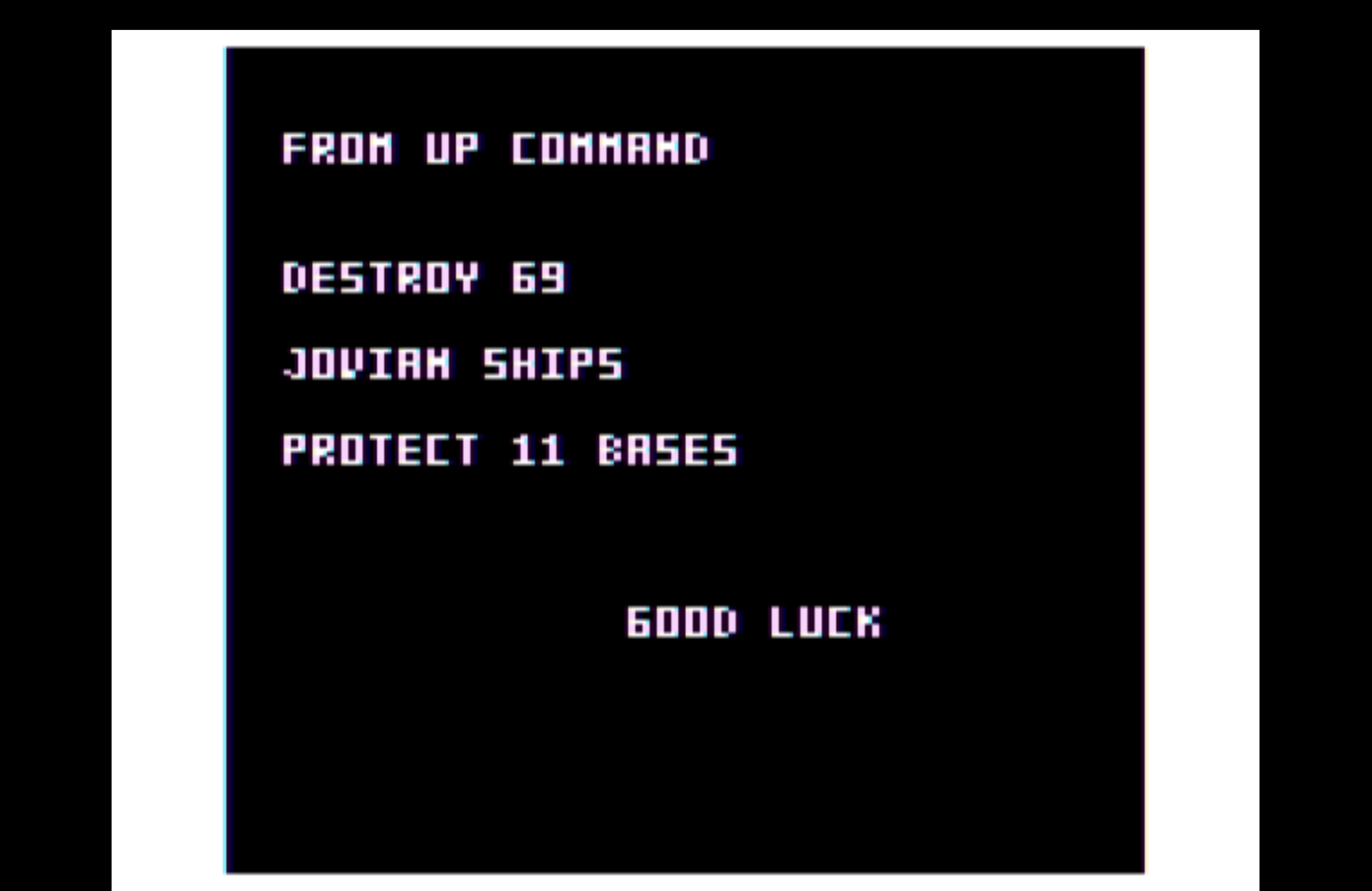 The graphics use NTSC artifact coloring, a technique that coaxes four colors out of a monochrome framebuffer by exploiting how old televisions decode the signal. Your ship glows blue. Enemy Jovians burn red. Maser beams streak across a field of colored stars. It looks like nothing else because it is nothing else. Every pixel plotted by hand, every keystroke read directly from the hardware. No operating system. No libraries. No safety net.