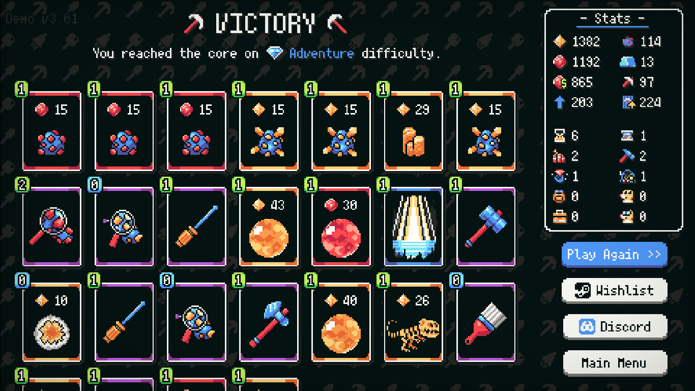 Finally managed to beat a run! Sledgehammer is crazy good for beating the game because of the amount of ore you get, and I stocked up on more than enough upgrades to just have my moonstones only go up and up.