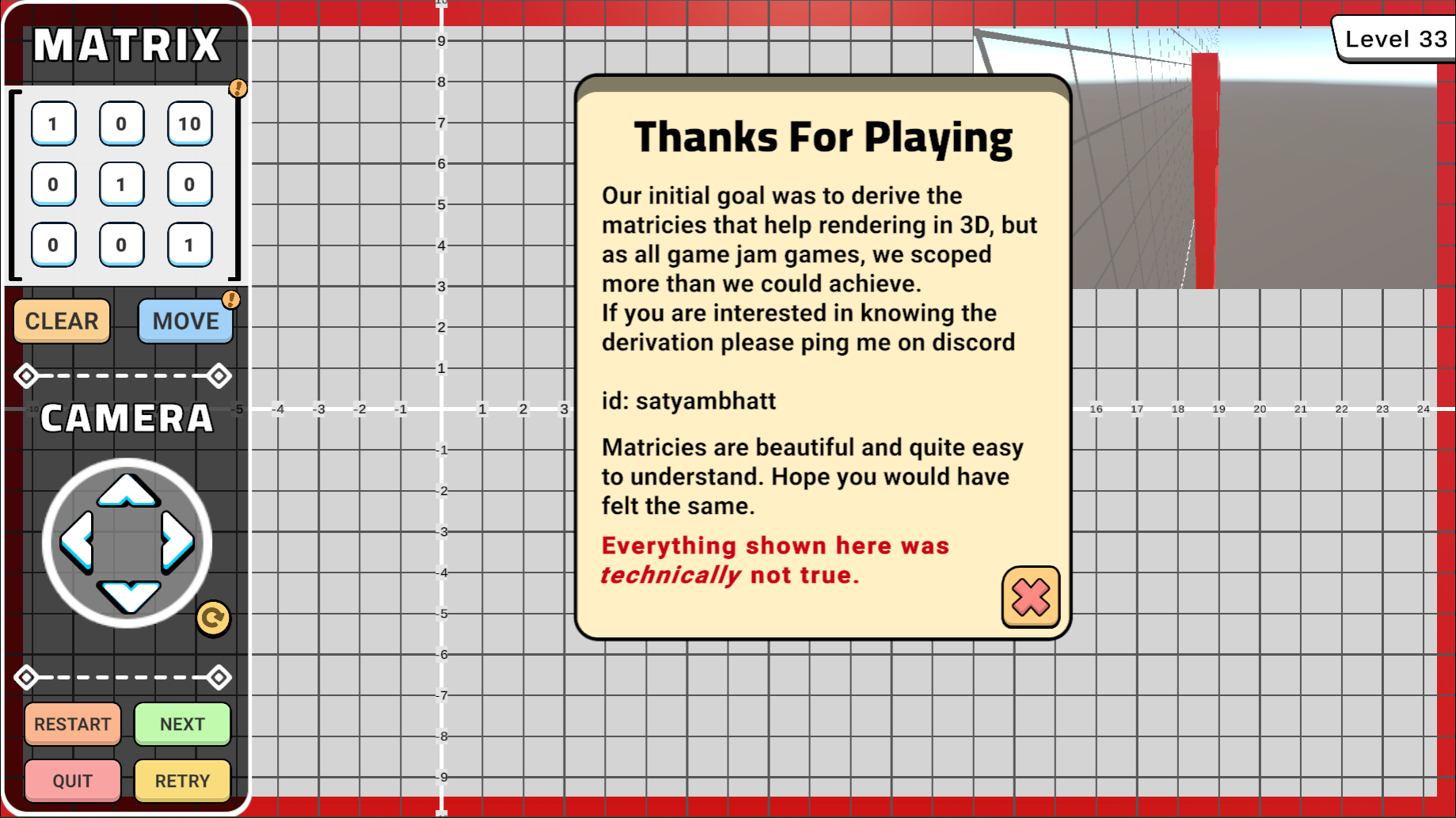 This is a very nice game, and I really like the idea! One thing I would suggest is if you wanted the game to be more of a puzzle than right now the levels are repetitive, and there isn't much until a new mechanic like the scale one is introduced. So, instead of having so many levels you could have focused on your goal of deriving the whole equation of matrix which might have improved the game further. Still it's a really good game and definitely something to be proud of. Good Job!