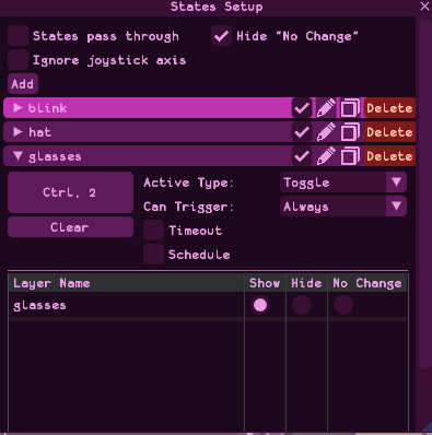 I've recently just started trying out RahiTuber and have been liking it so far! I wanted to try making a simple state that I could toggle on and off such as putting on glasses but when I tried putting in a hotkey, the state didn't change? I've tried all kinds of hotkeys like numbers or combinations such as ctrl+1 but nothing seems to be working. I do have a state for blinking that is scheduled and that seems to work. It seems that only my hotkeys are not registering?