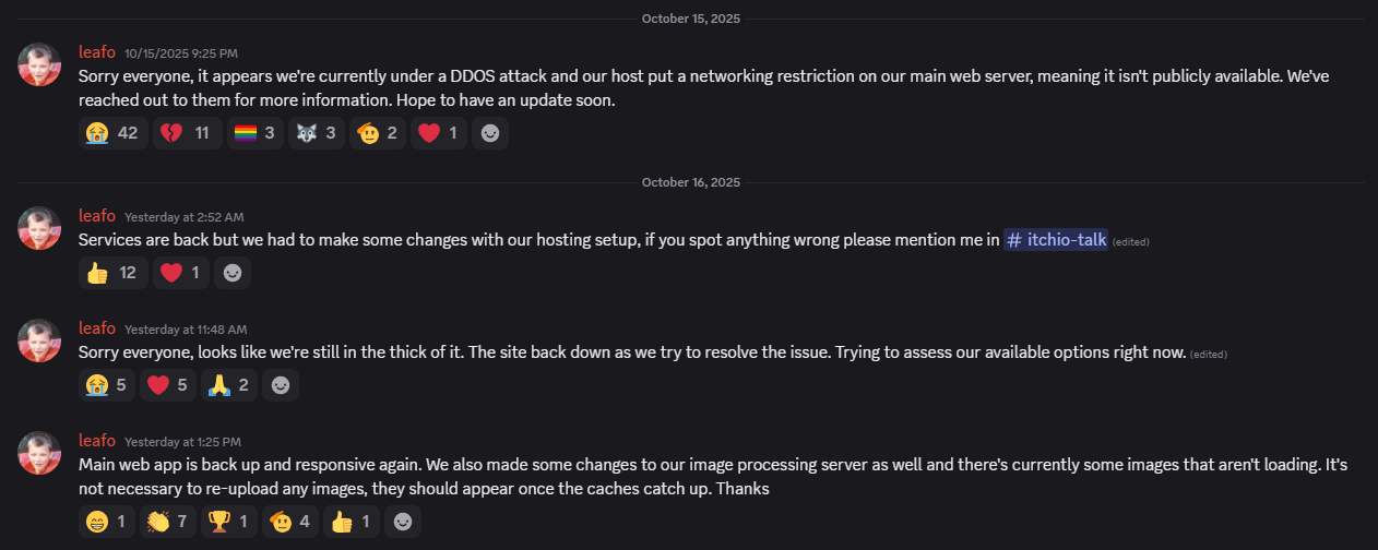 I've been selling on itch for 10 years and have generally been fairly happy with it, but some communication on the ongoing issues would be appreciated. The duration and scope of some of these issues is raising my eyebrows a bit- For example, the "On Sale" page showing 0 results issue is nearly a month old, and directly affects the storefront for both games and assets, so you'd think it would have been addressed quickly. It was also reported on itch.io's Github issue tracker, although it's unclear if anyone looks at that. Just kinda wondering, considering itch is a large part of my primary income... Is everything okay?