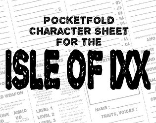 A character sheet for the Isle of Ixx in a Pocketfold format, with some Usage Dice Rules