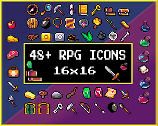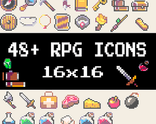 48+ RPG pixel icons made with the PICO-8 palette, perfect for inventories and fantasy games.
