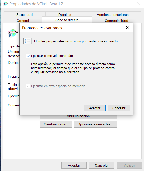 Para arreglar este error deberás configurar VClash para que siempre se ejecute como administrador de la siguiente manera: