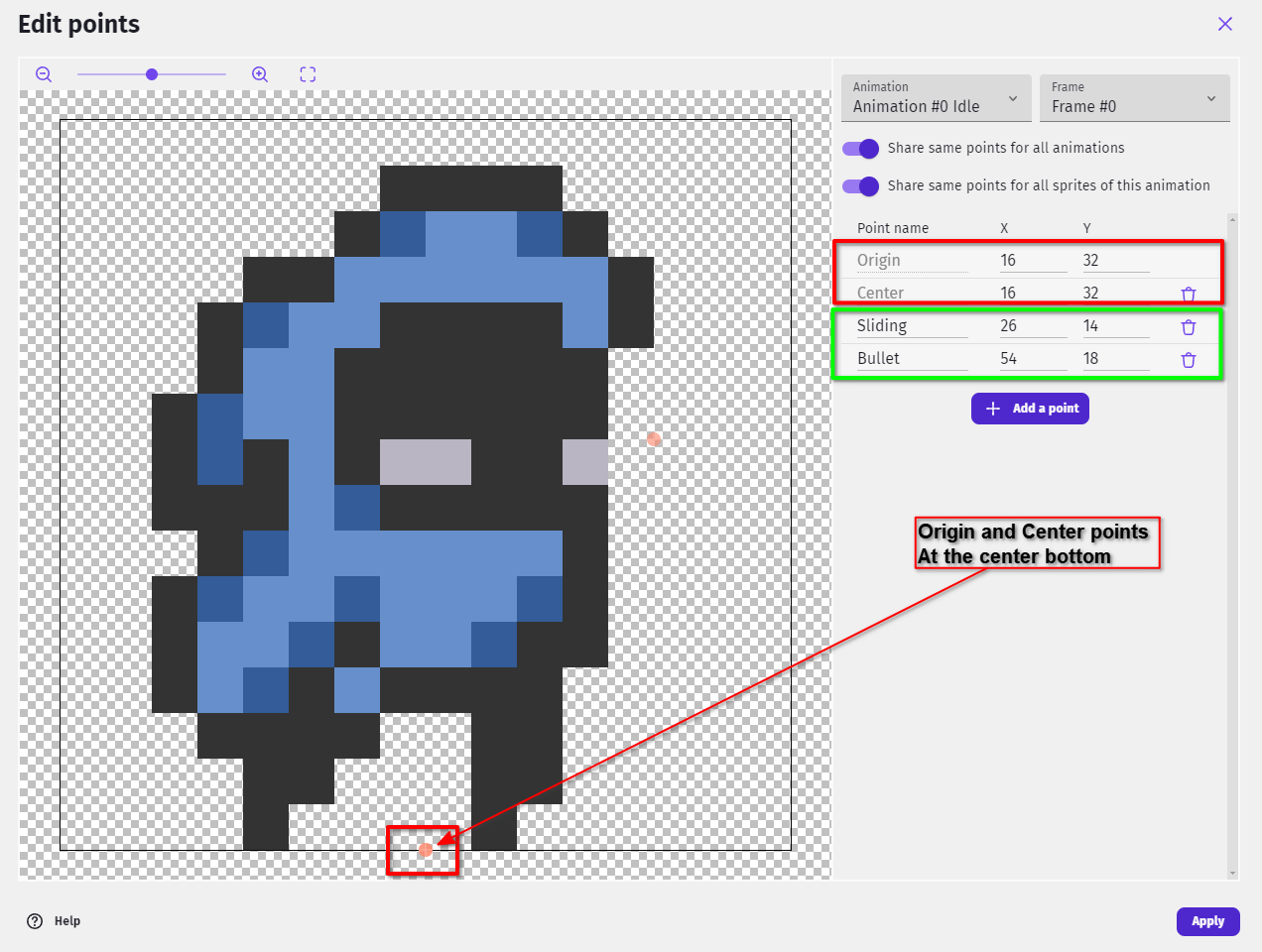 And make sure to add the Sliding and Bullet points as well (one used for particles and one used for Shooting bullet create position).