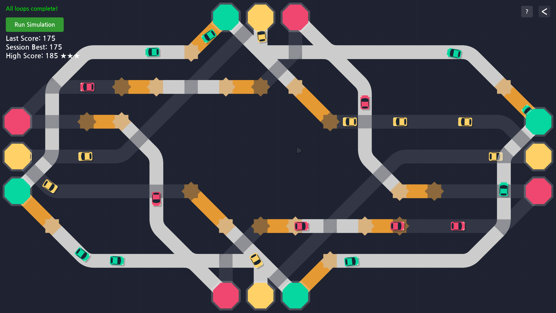 Really appreciate the reply, would have gone crazy not seeing a clean solution; now I'm sitting here like "Why didn't I think of that..." I think I convinced myself that splitting them all into their own tracks was going to be slower due to longer reroutes but clearly not. I think the systems are good; there's some learning and some tinkering, but I was able to get a pretty good understanding even without any direction from the game. Like for this level at first glance, one big ring through all the nodes looks like the fastest solution -- it's obviously not and I assume that's because the cars are slowing down the ones behind them as they spawn through nodes. This isn't a knock though, it's actually a good thing; I'm able to figure out the systems through gameplay instead of explicit guidance. Now obviously there's a balance to be had between the two, and that could be found through iteration, but even the presence of that dynamic is laudable, especially in such a short time frame. It's only because I got so obsessed with this game and that I like it so much that I've noticed some of the hidden, unexplained things (seemingly cars don't have to go through every node of their color, just return to the starting node) that both frustrated and intrigued me. The more I thought about it, the more this feels like Poly Bridge than MiniMotorways. I can beat a level with endless tweaking and optimizing, but sometimes you need to step back, scrap a whole idea, and start fresh, and that is very, very, very cool. Anyway, thanks for making the game and sharing it, if it's not clear from my rambling, it's awesome and I love it.
