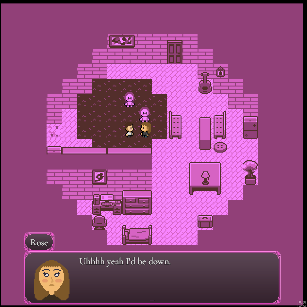 Hey yall, just making a quick post about a game that I just released, A TRANSFormative Night. Loosely based off of I night I spent with some friends. Honestly just posting here because most of my other games are for game jams, and this is the first project I've made just for myself. I had a lot of fun working with the colors of this one, as every asset other than the two main characters are pink. Helps add some neat contrast I think.