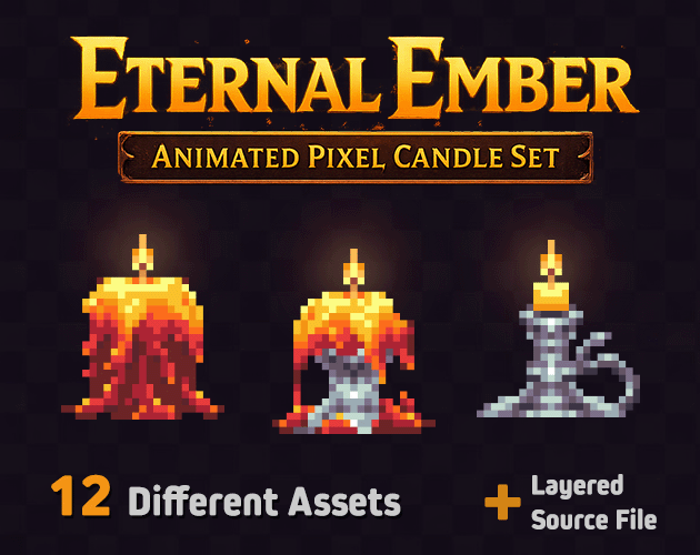Bring your dark corridors and mystical shrines to life! Eternal Ember is a meticulously crafted asset pack featuring a variety of candles and candelabras, each designed to add a warm, flickering atmosphere to your pixel art games.