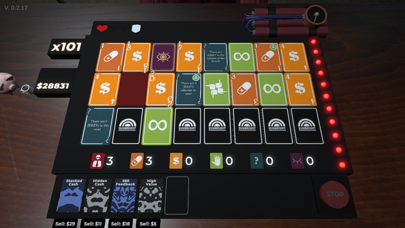 I didn't expect to see a roguelike minesweeper card game... Really fun and addictive! I like the fact that it allows for a lot of different strategies. I can beat monday with more than an hour left, but I didn't manage to beat tuesday yet. Health and reactivation door are both quite annoying, health is nice when I need it, but most of the time it's just in the way of the default 10$ door. Same for reactivation, they usually just reactivate each other and are of no real use, which brings it down to pure luck which doors you get.