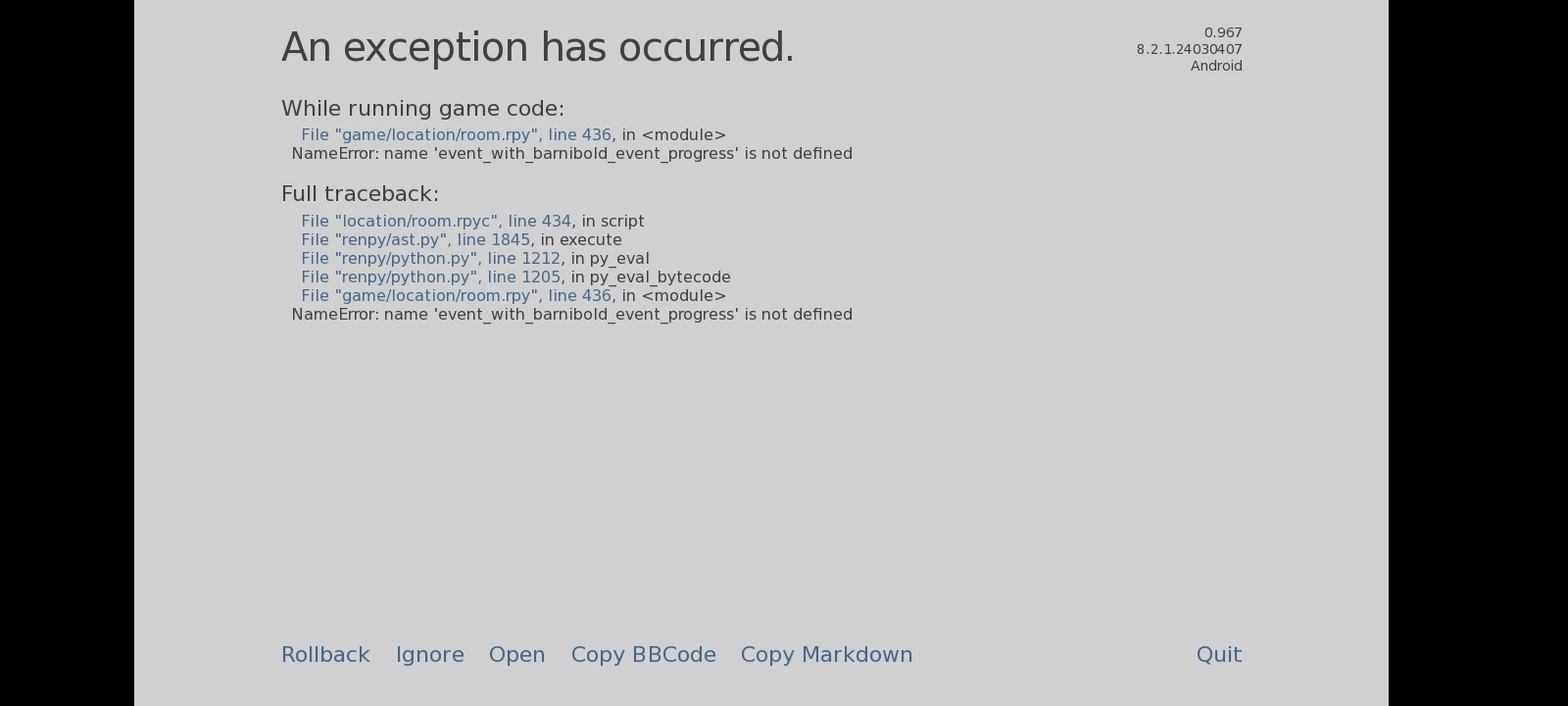 Im having issues with errors occuring during gameplay. Like those white screens that give you the option to rollback and ignore. And it isnt a small issue that i can ignore either. Its like every time i click i button i grt smacked by one of those screens. I didnt even manage to leave the apartment before gitting hit with these. Dont rlly know how to fix it. I just want some pointers. (Android so im a little cooked)