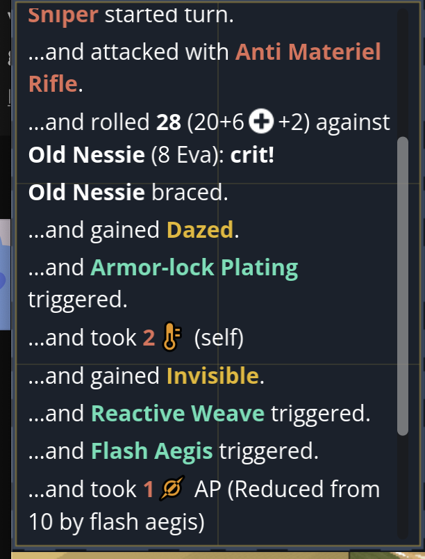 Thinking about it — we could probably do more to telegraph what rxns will potentially trigger on a given attack in that percentage preview window. I’ll make a note to try out some designs for that.