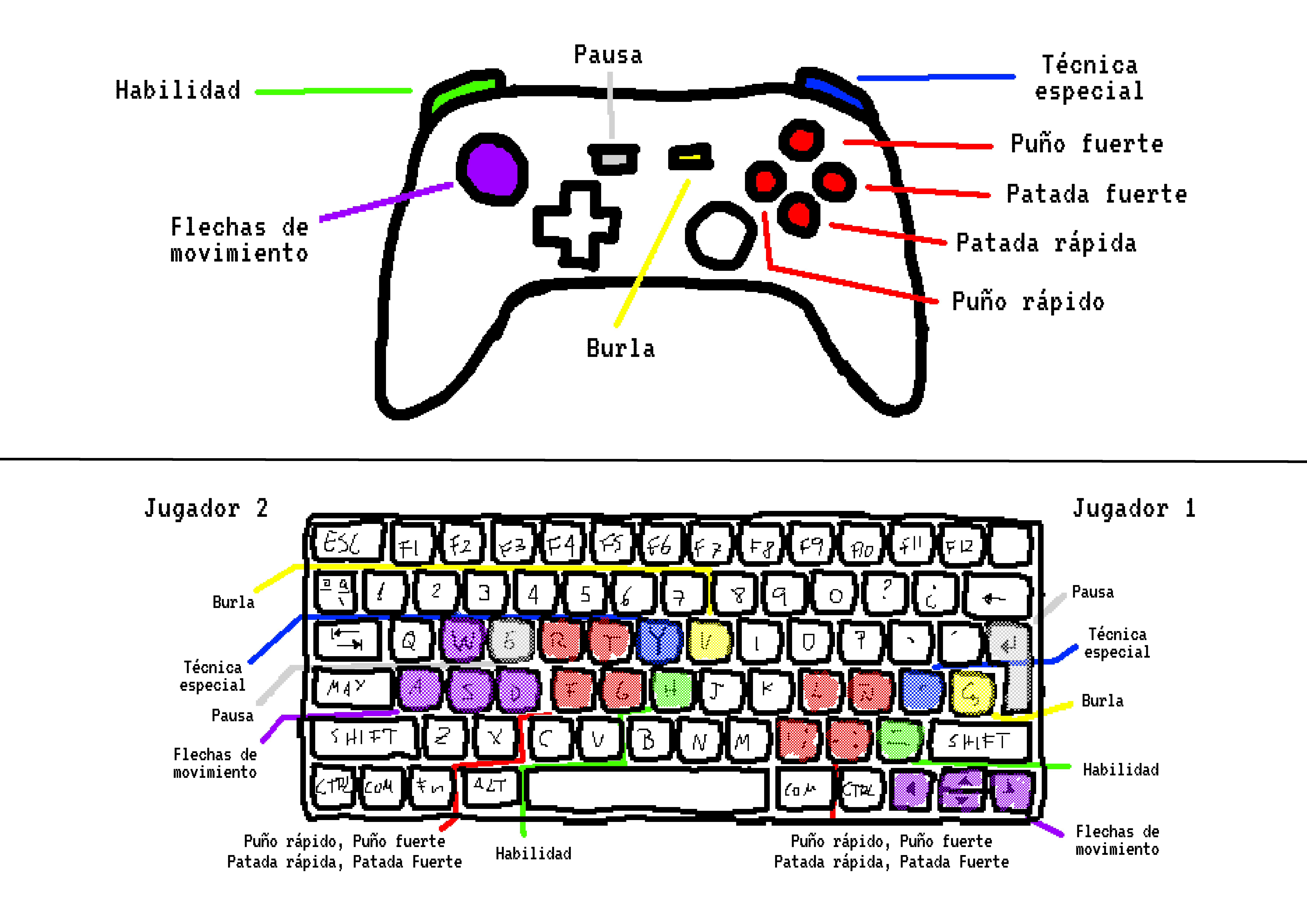 Golpes y Porrazos se juega con 7 botones y las flechas de movimiento. Puede jugarse tanto con teclado como con mando. Aquí los controles por defecto: