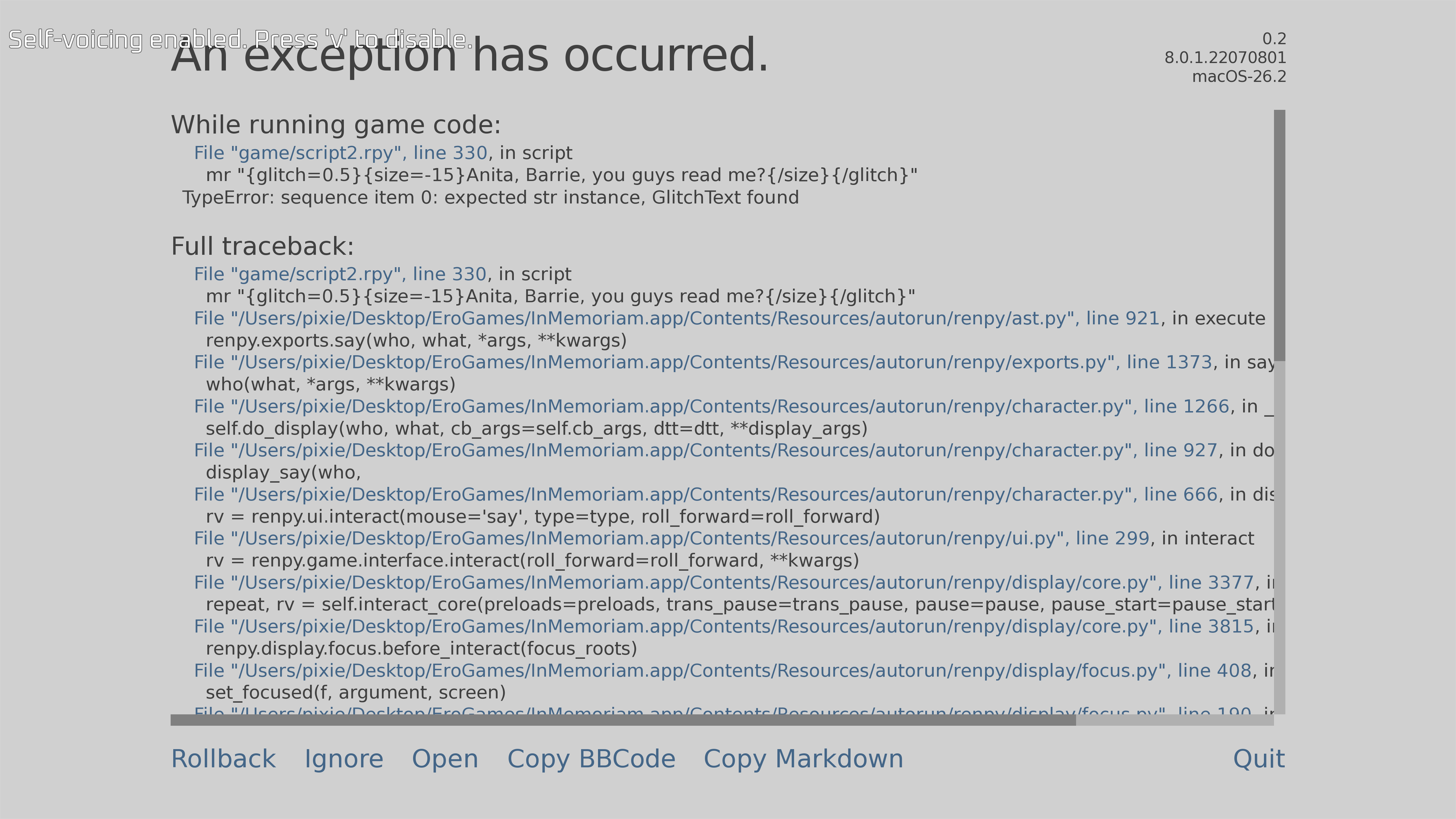 Mac & I get an error each time someone other than Barrie speaks during the spacewalk. I get no issues during when we see Anita visit her aunt in the hospital or after coming back from the spacewalk