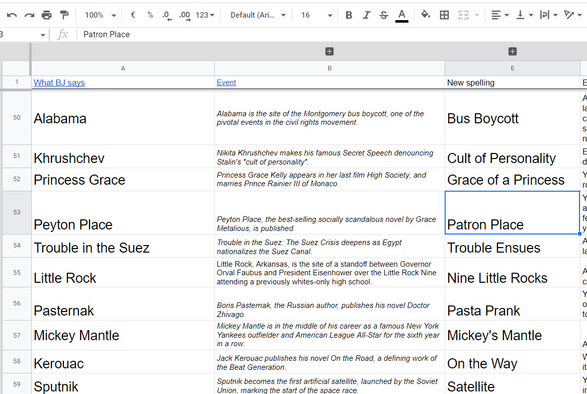 I first had to take a list of all 118 historical references in the song (from the Wikipedia page) and turn them, in a localized Jojo's Bizarre Adventure's fashion, into an (ideally) setting-agnostic version of what Billy Joel was saying or alluding to.