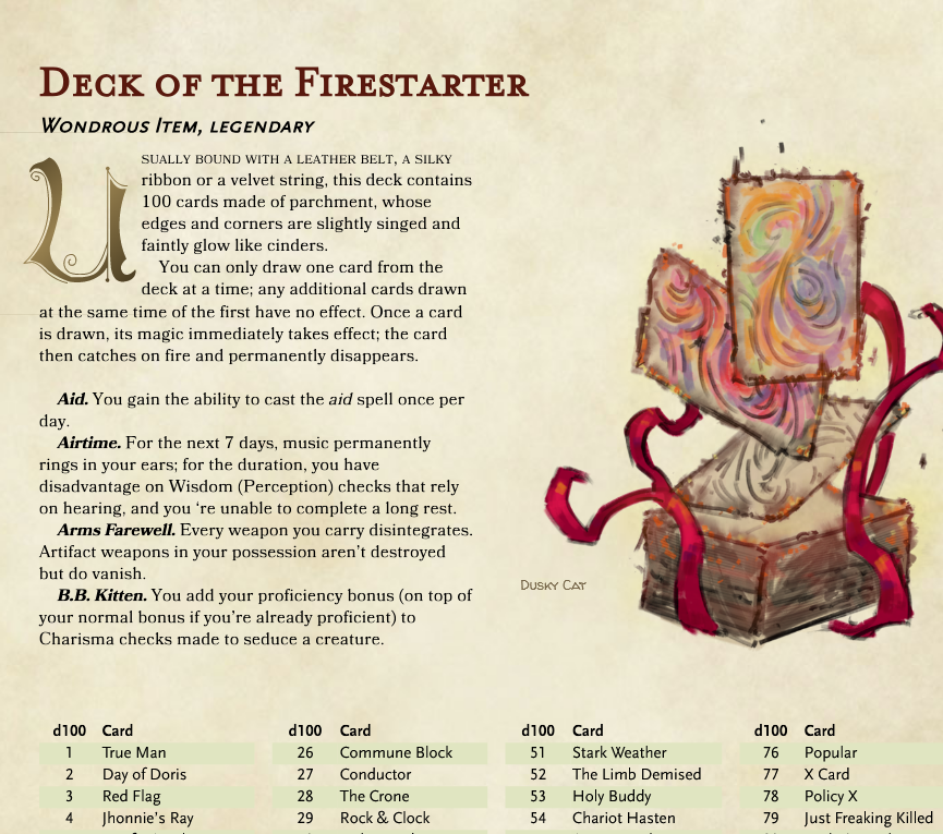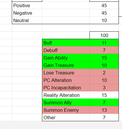 I also had to make sure the entirety of the items' effect was balanced (like the original Deck of Many Things) and tracked the main categories that each effect fell into, to ensure enough variety.