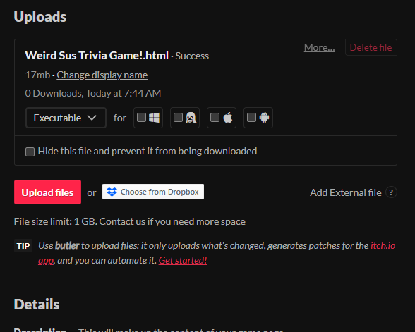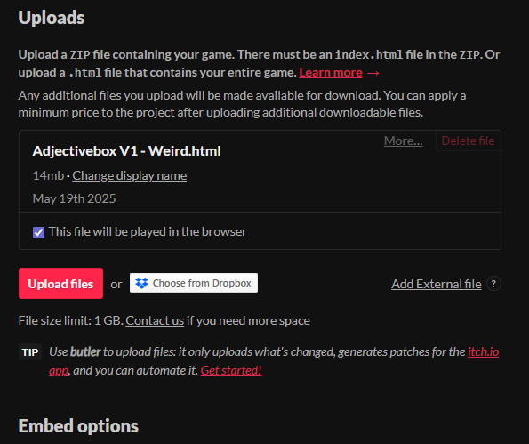 For the uploads section, all I can see in my "file box" is "Delete", "More...", "Change display name", and the method of running the game. But the box that allows it to run in the browser? NOWHERE TO BE SEEN! Absolutely pathetic and disgusting how itch won't let me submit games like these anymore.