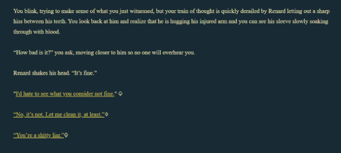 Hi! I just started playing the game and I found a small issue. I'm not sure if you're aware of it yet, so I apologise if you already are. I also haven't played through the entire game yet, so I don't know if it happens again elsewhere. Basically, my pronouns are set to he/him, but in these two lines Carmilla refers to my character as 'her.' I attached screenshots below. I thought that I might've chosen the wrong pronouns at the beginning, so I restarted, and it happened again. She also used the correct pronouns a few lines earlier.