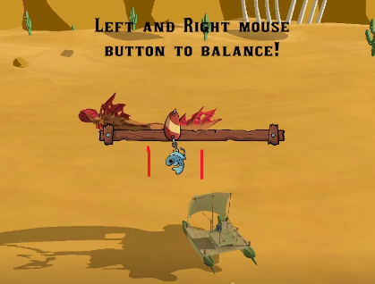 Hi, we are fishing in the desert because the theme is out of place and we thought that'd be fitting :)To catch a fish you need to balance the hook over the fish image like so, if your hook falls out of that range the rope breaks!