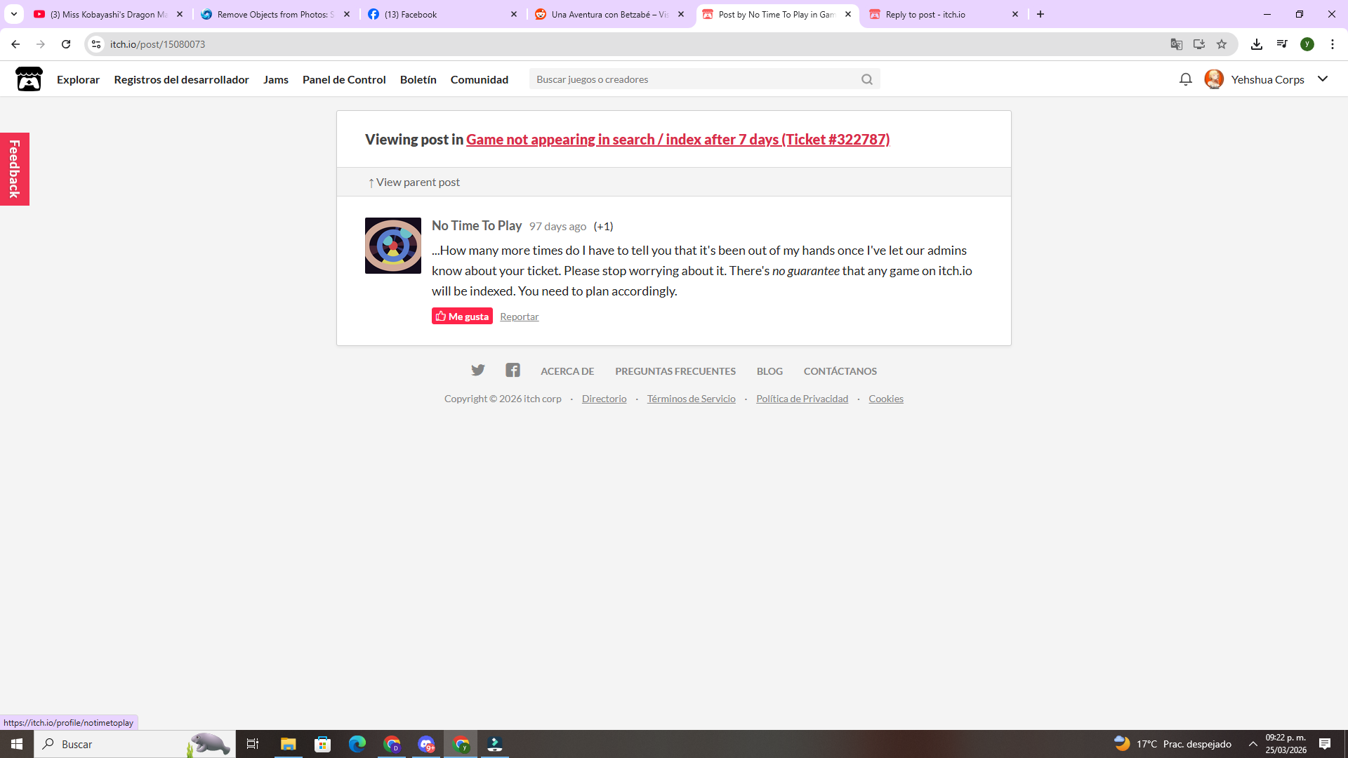Hello, nice to meet you. If you’re talking about indexation inside itch, I’ve actually been contacting them for a long time. After insisting a lot, a moderator told me that itch is not obligated to index my game, and that he already informed the admin. Since then, it’s been over a year, so I didn’t want to keep bothering them, as that seemed to be the final answer — that they are not required to do it, even if everything follows the rules. So, unfortunately, that has been my situation.