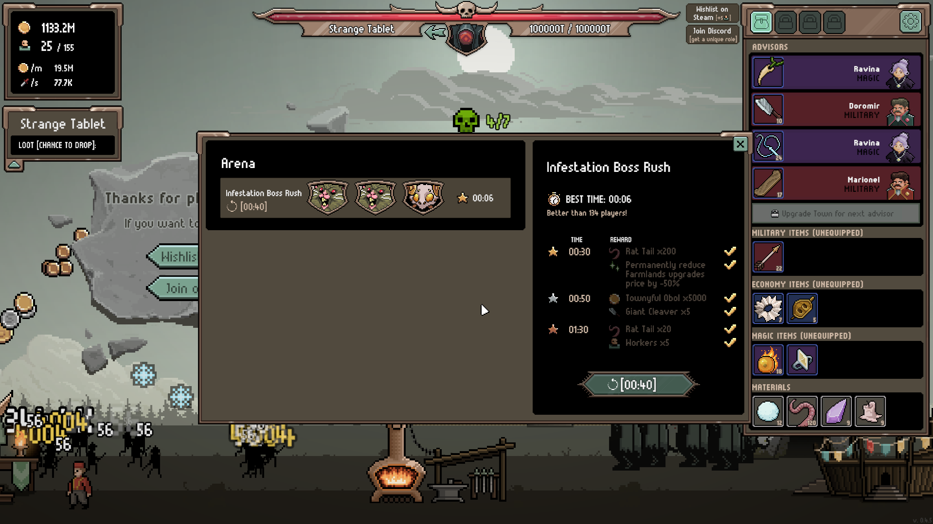 fun demo, great tier snout brooch seems a bit over powered. would be nice if there was a way to change advisors, maybe a rare boss drop or upgrade materials. In the end game and for the arena most of the time spent is looking at the boss death animations, would be cool if they were faster. here is my high score: