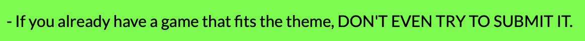 Preventing other questions: everything I wrote in the jams description that is not allowed is not allowed. What I haven't written - allowed. I know that I could forget to write something, so don't write if you think that it's normal and I won't argue about that. In situation you are confused or just don't know - feel free to ask.