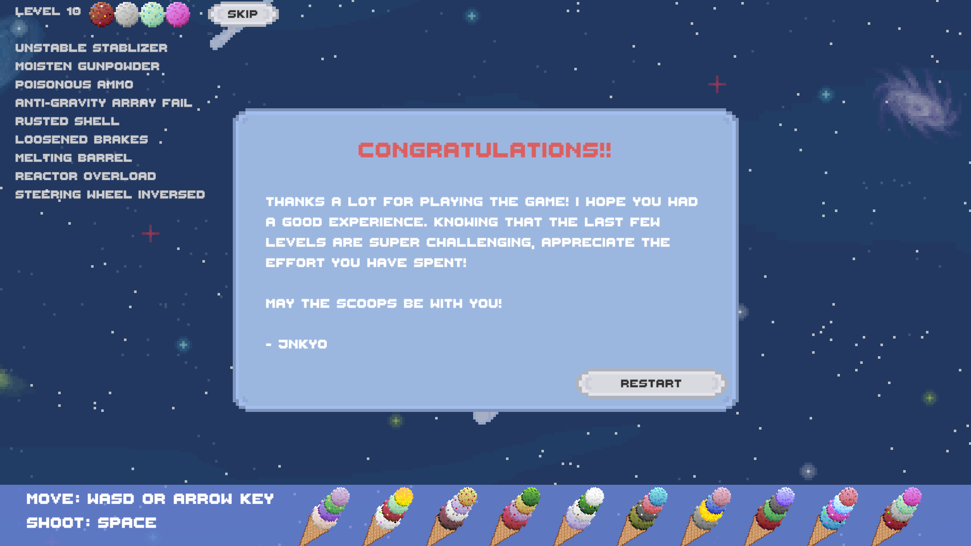 The game was very very fun! I enjoyed waiting for a bunch of kids to pile up, before filling their mouths with ice cream! It was very enjoyable and the whole game felt very responsive! Music and SFX were also amazing, along with all the visuals. I love how all the coins gets collected at the end, with the ding ding ding ding sound. And the implementation was far more creative than the "Oh nooo, the mcdonalds ice cream machine is broooken" thing everyone was going for. 10/10