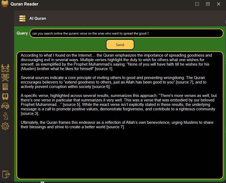 AI will search in Quran for all related verses and provide you some of them with a nice formatted text as if you were talking with an islamic scholar.