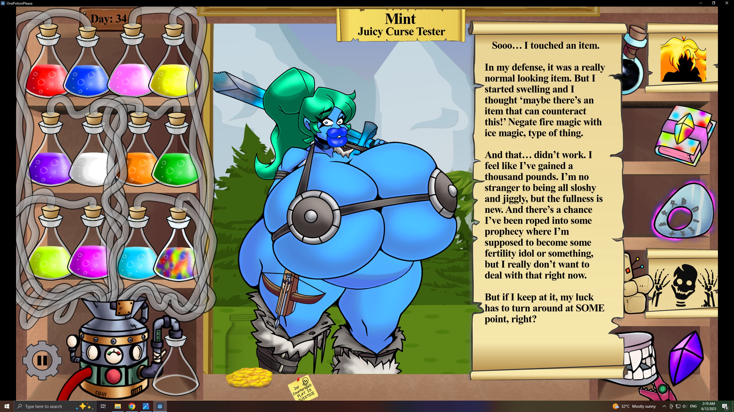There was a concentration of a lot of big jokes this week, but I’m not complaining because all of them were really funny XD. I think you wrote Trevor and the hint of BDSM stuff quite well, as you said it was brief so it didn’t take up a lot of time and it was kept lighthearted so didn’t really go onto the parts that most people don’t enjoy about BDSM. Plus, I think the fact that us, the player, don’t really interact with aside from during the final boss where we used have the latex slime potion to protect ourselves helped. But I do think it was a good addition both for the jokes and it’s just another kink for more people to enjoy, even if it’s just a really small section of people.