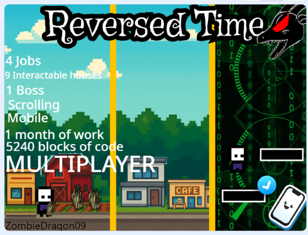https://zombiedragon09.itch.io/reversed-time-v13-multiplayer In this 2D scrolling game you go back in time but your time machine broke, so you travel through the years slowly getting your parts back! I'm not gonna spoil too much but theres something cool at the end, just dodge there!