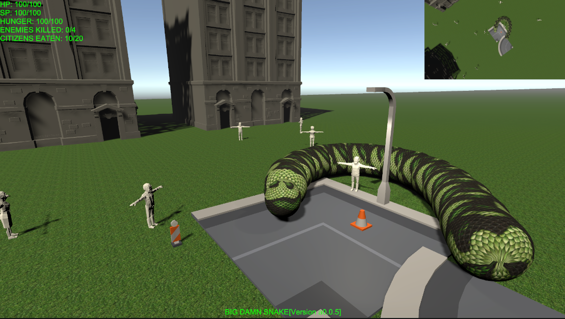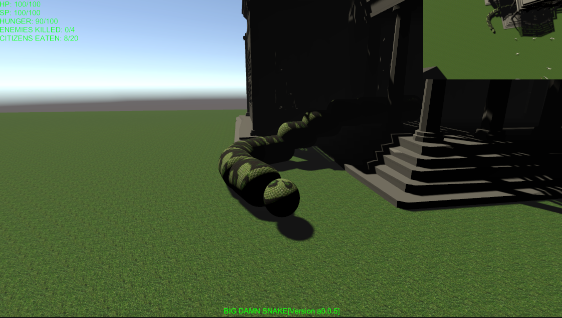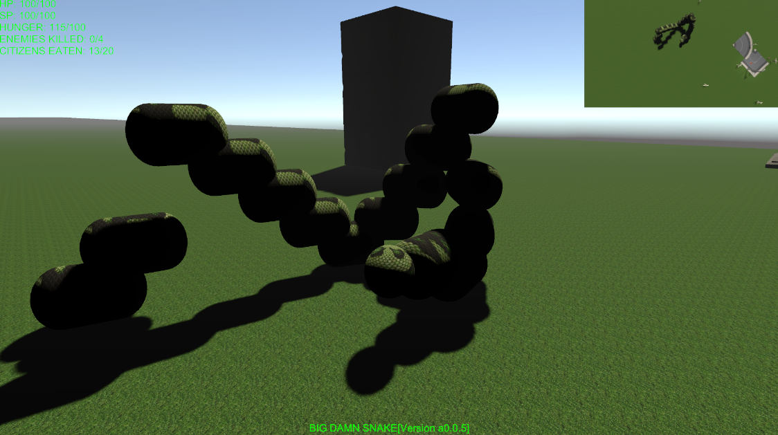 Snake now grows segments as it eats citizens and makes a chomping sound (Really bad stock one for now). Figuring out Unity's sound system so I can make a proper rumbling sound when the player's snake moves across the ground (doesn't work well as is so really need either figure out if I can integrate C# System sound detection (maybe System.Media or similar) or maybe a separate sound manager for snake sounds VS other sounds).