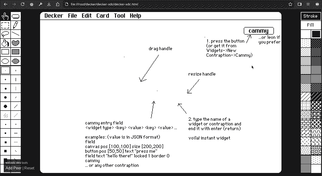 The code blocks on this page are what it looks like when you copy and paste one or more widgets in Decker. When you copy a Contraption to the clipboard, it carries along the associated Prototype (contraption definition), which makes it possible to share them like this or easily copy and paste them between decks. The same idea applies to copying and pasting cards.