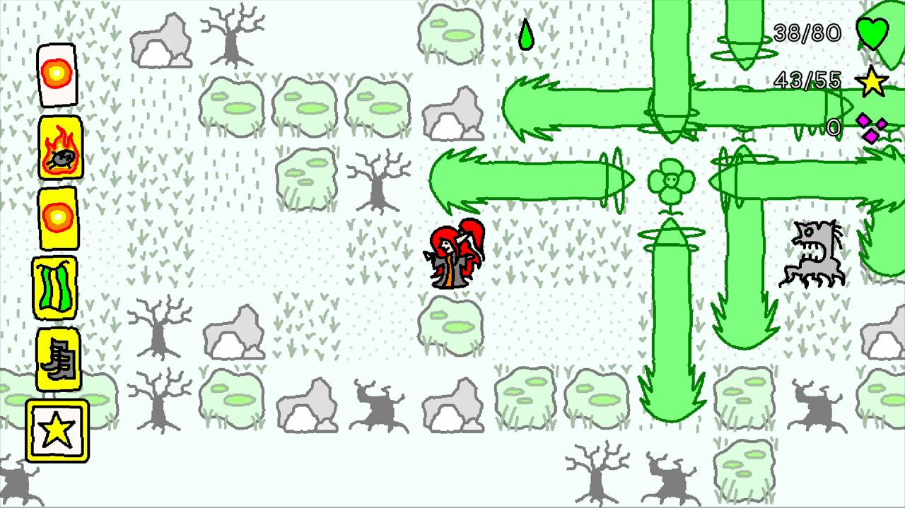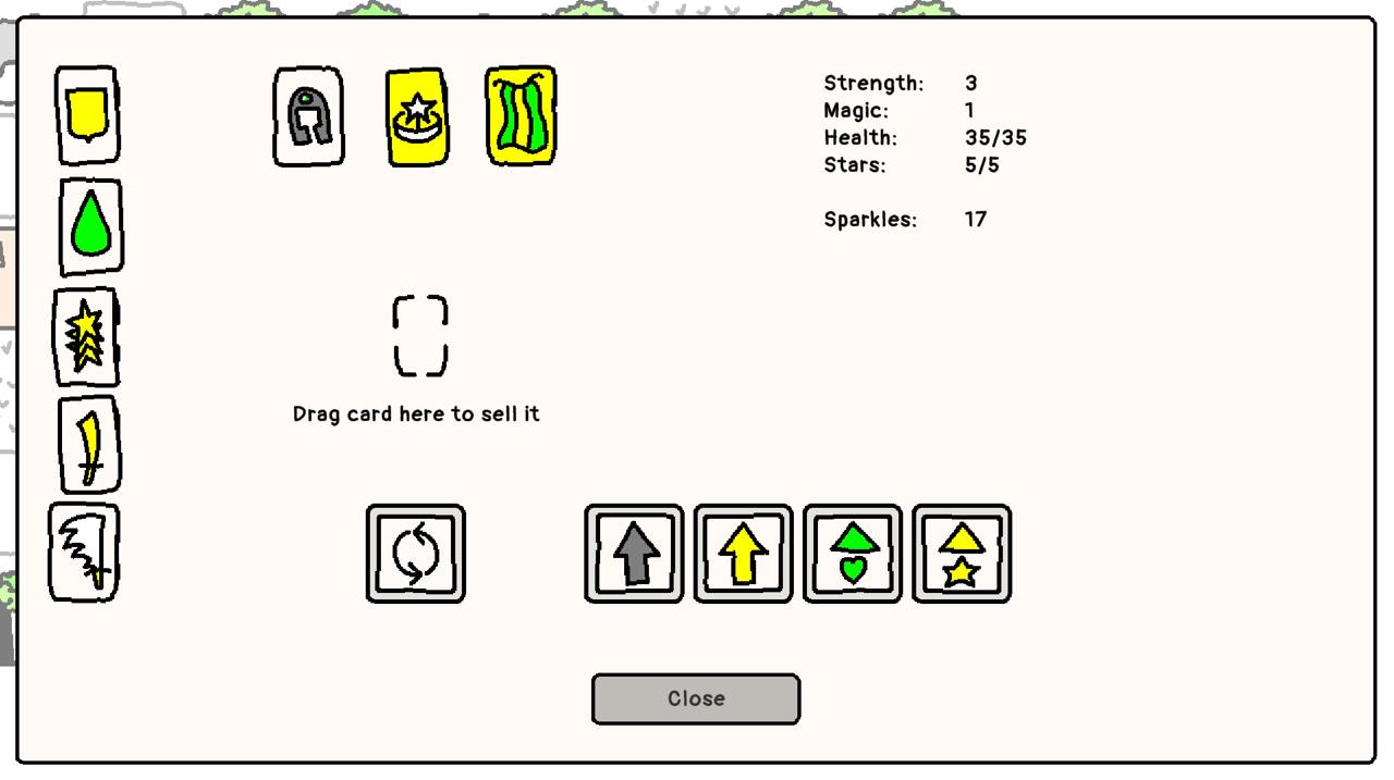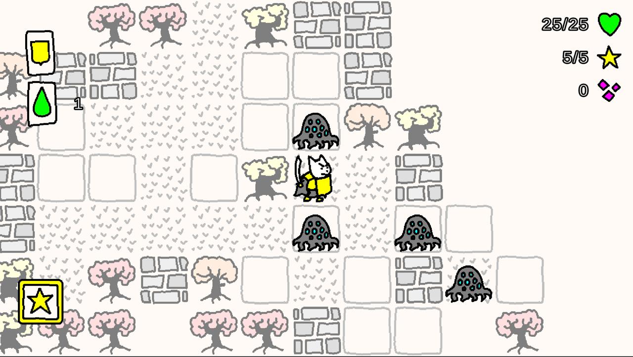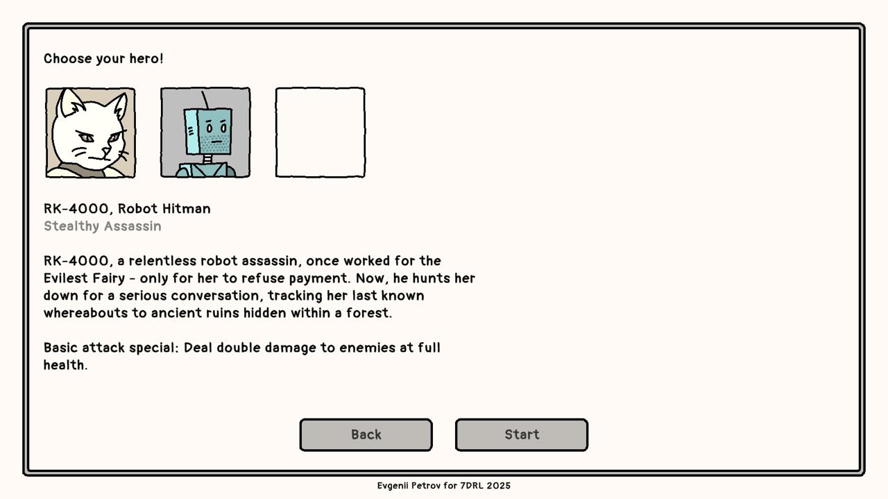 I played a lot of Slay the Spire in 2024, and my first intention was to go in the direction of a ‘compact deckbuilder,’ which evolved into some crazy idea where a player has a hand of 5 cards and no deck. Then Balatro came, and I was afraid that the 7DRL jam and the genre in general would be flooded with Balatro-likes (which actually does not seem to be the case), so I ditched the idea of a card game but retained some elements of that 5-card-hand.