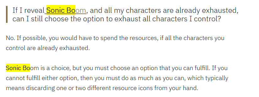 A: No. If possible, you would have to spend the resources, if all the characters you control are already exhausted. Sonic Boom is a choice, but you must choose an option that you can fulfill. If you cannot fulfill either option, then you must do as much as you can, which typically means discarding one or two different resource icons from your hand. -(Developer Ruling, Hall of Heroes)
