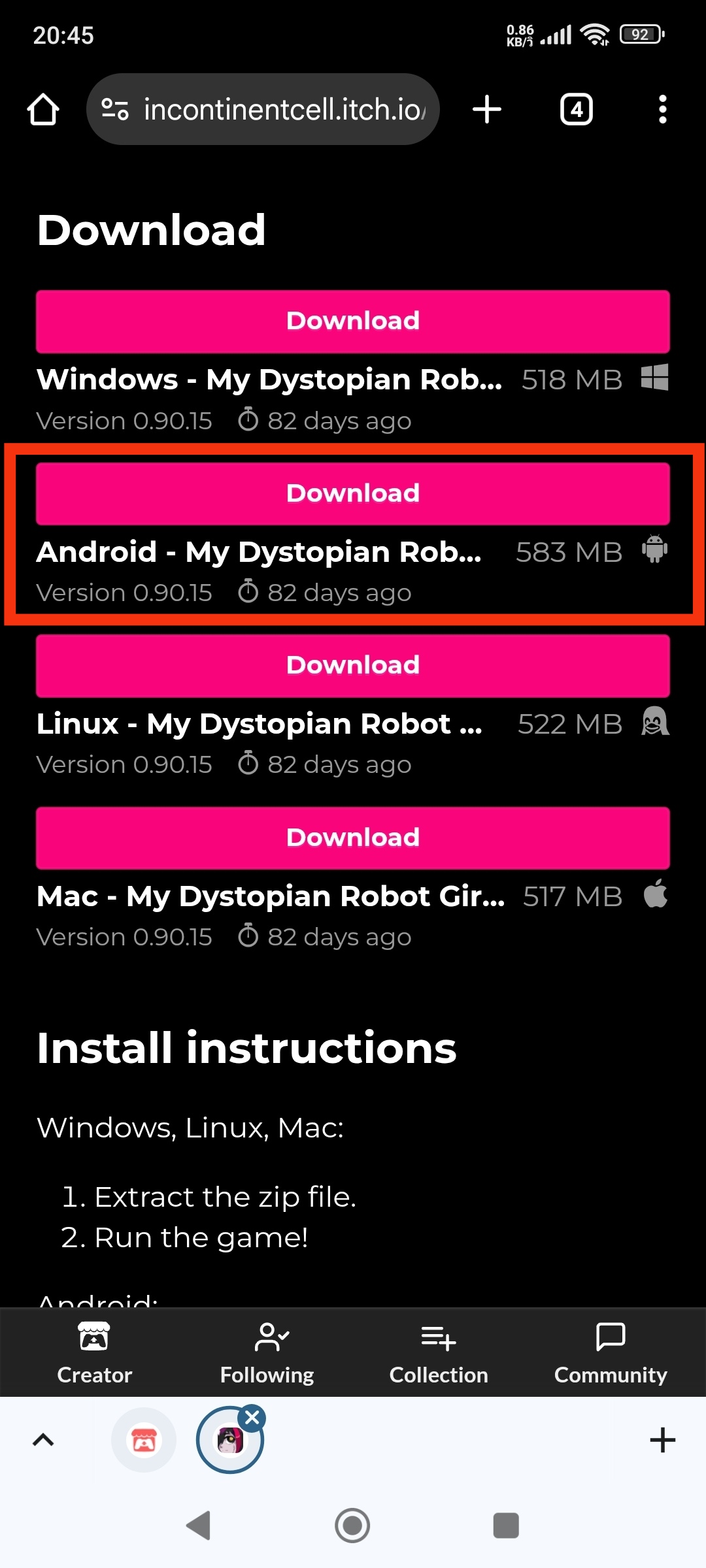 я люблю играть в браузере, а здесь проблема на Андроид, сохранения все слетают а загрузить их в Файл невозможно, сколько не жми не скачивается, так же не работает кнопка Из файла. Я просто играл в Браузере долго, и в сюжете очень далеко продвинулся заработал состояние, но все сохранения слетели и начали слетать постоянно, притом я Кеш не очищал