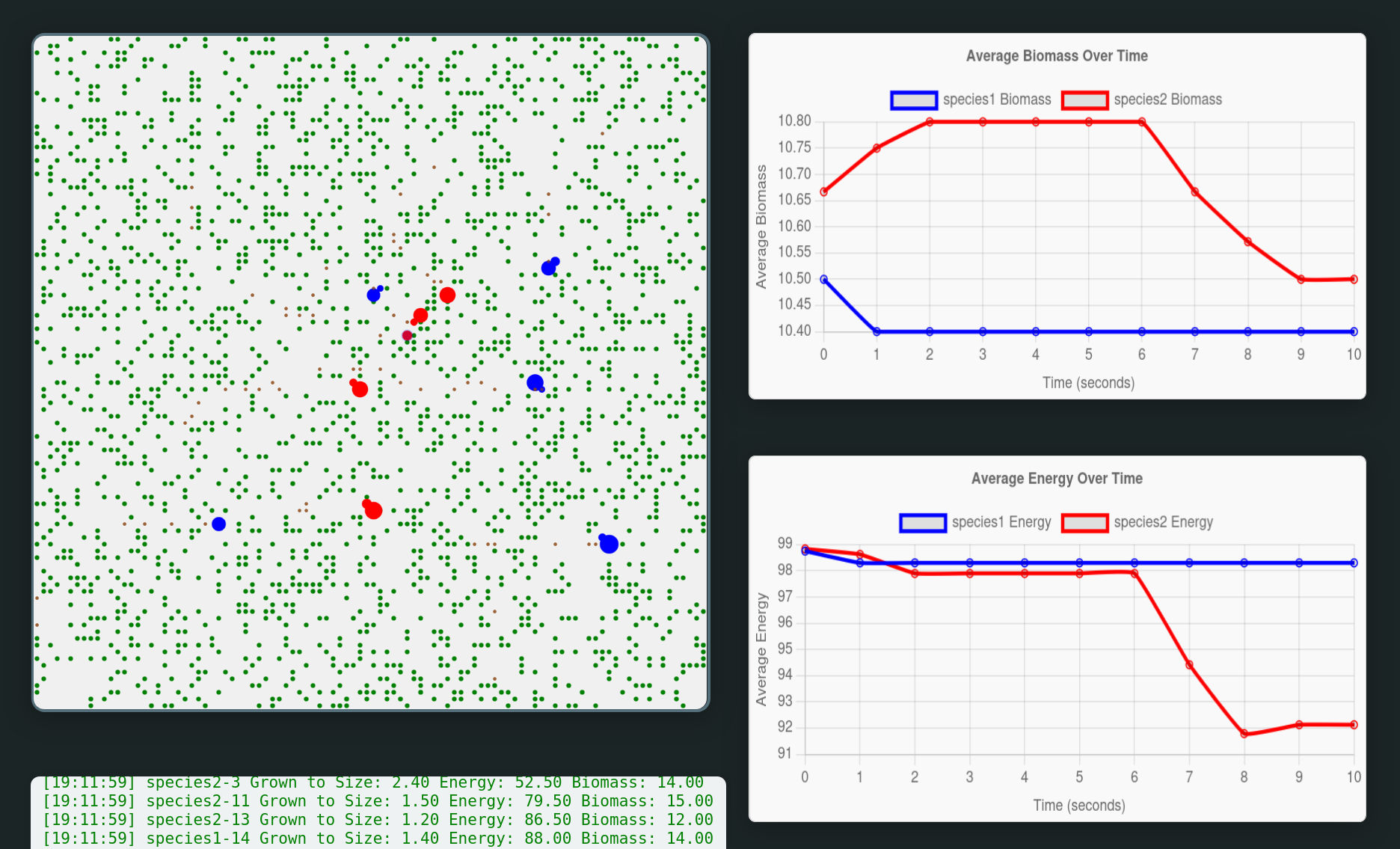 - Customizable Species: Define growth rates, reproduction thresholds, initial biomass, and energy for multiple species, with the ability to add new species dynamically.