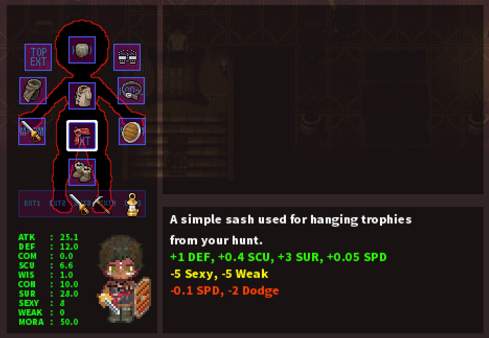 The Sash(SurMidExtra) gives 0.05 AND takes away 0.1 speed; this might be leftover from copy pasting code from another outfit as a base since I noticed some clothes have a hidden from their description negative speed stat ex. most of the Adventure parts have -0.1 each, except the Cape.