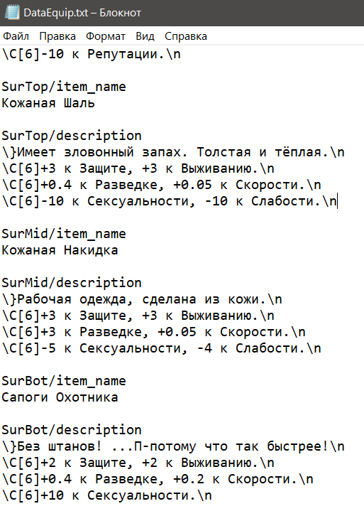 I noticed when I was looking through the code to change the translation files to show the stats in equipment, items, and states descriptions rather than just mentioned of increases or decreases, that I believe the Survival set seems to have some oddities.