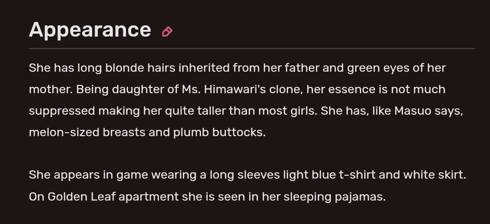 Find that out at one of the ending of HTA. They are immune to not falling for him if they watch but if they have sex with her that's another story. That image is from a farming sim I wanted to include in Magic Ring game as a mini game. Himawari was gonna be one of the bachelorette . Since it's scrapped used that image to take a jab at using AI to create image. I think it's mentioned when you interact with that image in college level.