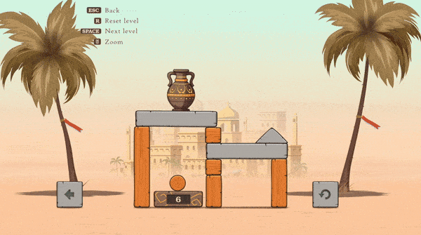 Destroy blocks strategically to land the sacred Ember Jar on the shrine. Do not let the Jar touch the ground or it will break and release a curse upon the city of Azarbād. Minimalistic and snappy with a trial and error type of gameplay but fun to discover unintended ways to finish a level.